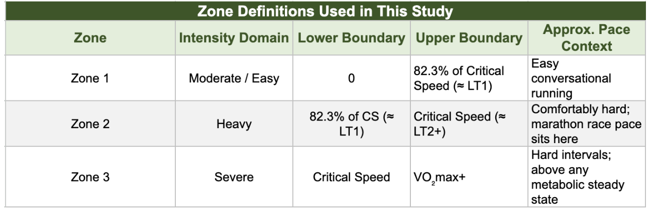 The training zones were determined by analyzing each runner's best performances across distances ranging from 400m to 5,000m recorded on Strava. Previous research has validated this as a reliable method for estimating critical speed (CS). The boundary between Zone 1 and Zone 2 was set at 82.3% of CS, which approximates the first lactate threshold (LT1). The boundary between Zone 2 and Zone 3 was set at critical speed itself, which sits close to LT2 — the intensity above which a metabolic steady state can no longer be maintained and cumulative fatigue becomes inevitable. This is a well-established and practical way to partition training intensity, and one that many coaches and athletes already use.