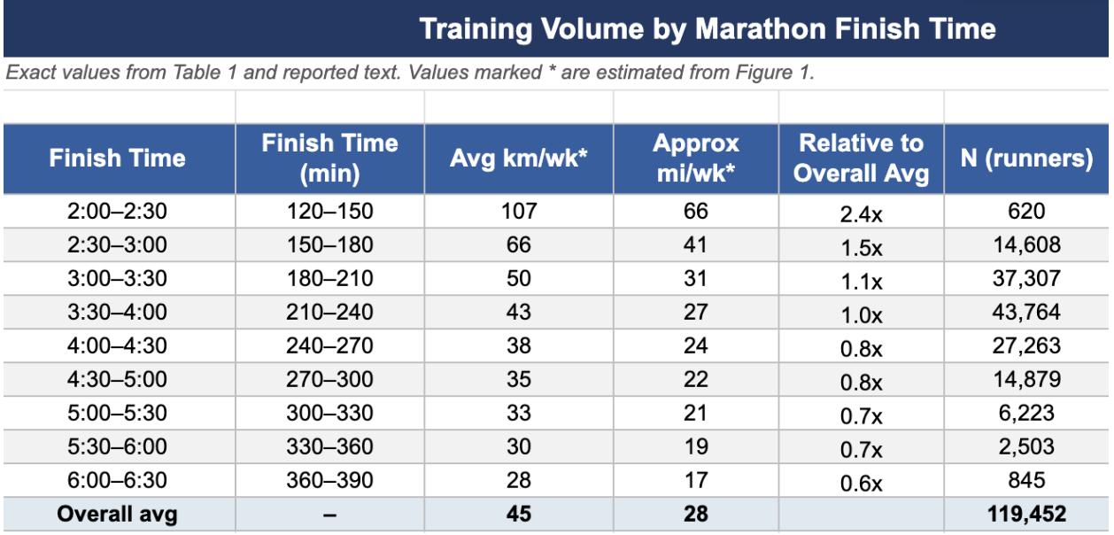 This study also gives us rough mileage benchmarks worth keeping in mind, with the obvious caveat that any target needs to be individualized. For example, a 25-year-old male runner with Boston Qualifier ambitions should probably be working toward an average of 50-60+ miles per week. Runners finishing under three hours in this dataset were consistently sitting in that range. Keep in mind these are average weekly figures — peak weeks during training were likely meaningfully higher.