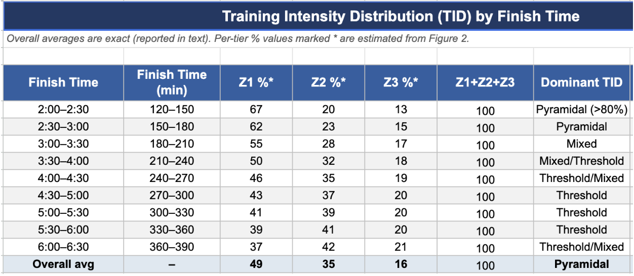 This table shifts the focus from volume to intensity. As finish times improved, a progressively larger share of training time was spent in Zone 1, with less time in Zones 2 and 3 — a pyramidal distribution. There was a positive relationship between the percentage of training completed in Zone 1 and faster finish times, and a negative relationship between Zone 3 training and performance.
