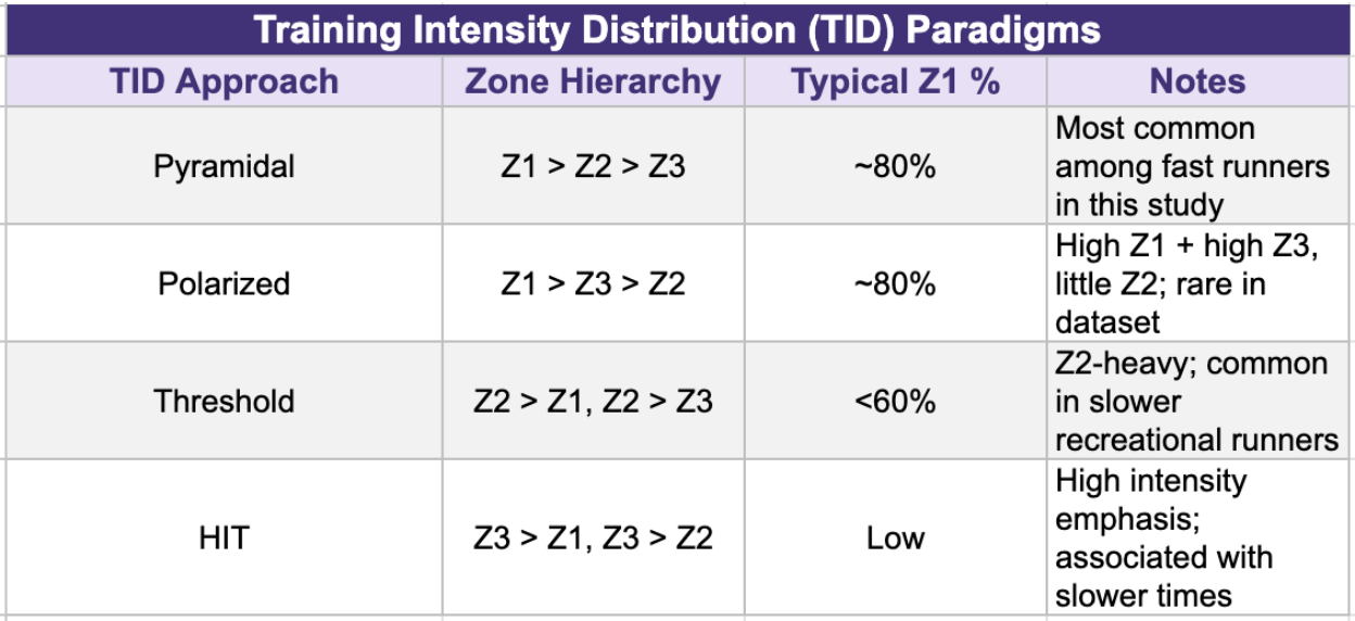 The researchers also defined four training intensity distributions (TID), shown in the table below: