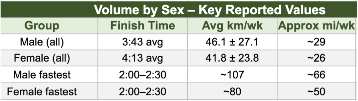 This table reinforces the volume finding and compares weekly mileage in the fastest performance tier against overall averages by sex. Again, the relationship between higher average weekly mileage and faster finish times is evident.