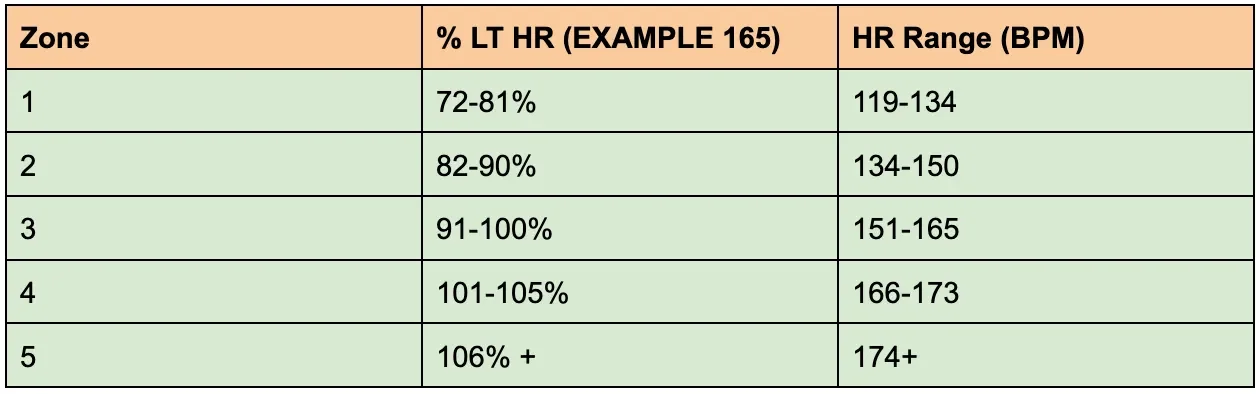 In this case, training zones are created by using % of Lactate Threshold Heart Rate (LT). In this example, zone 2 is around 81-90% of HR @ LT. In other cases (not pictured), it might be defined around 60-70% of HR max, or % of Vo2 max or 1.5-2.0 mmol of lactate. Yes, this is confusing. And to make it even more confusing, some coaches use a three zone or seven zone system rather than a 5 zone system. So, there is certainly a definition problem, but we will proceed through this blog as best we can. For what it is worth, I prefer to use % of lactate threshold in my own training and the athletes I have coached.